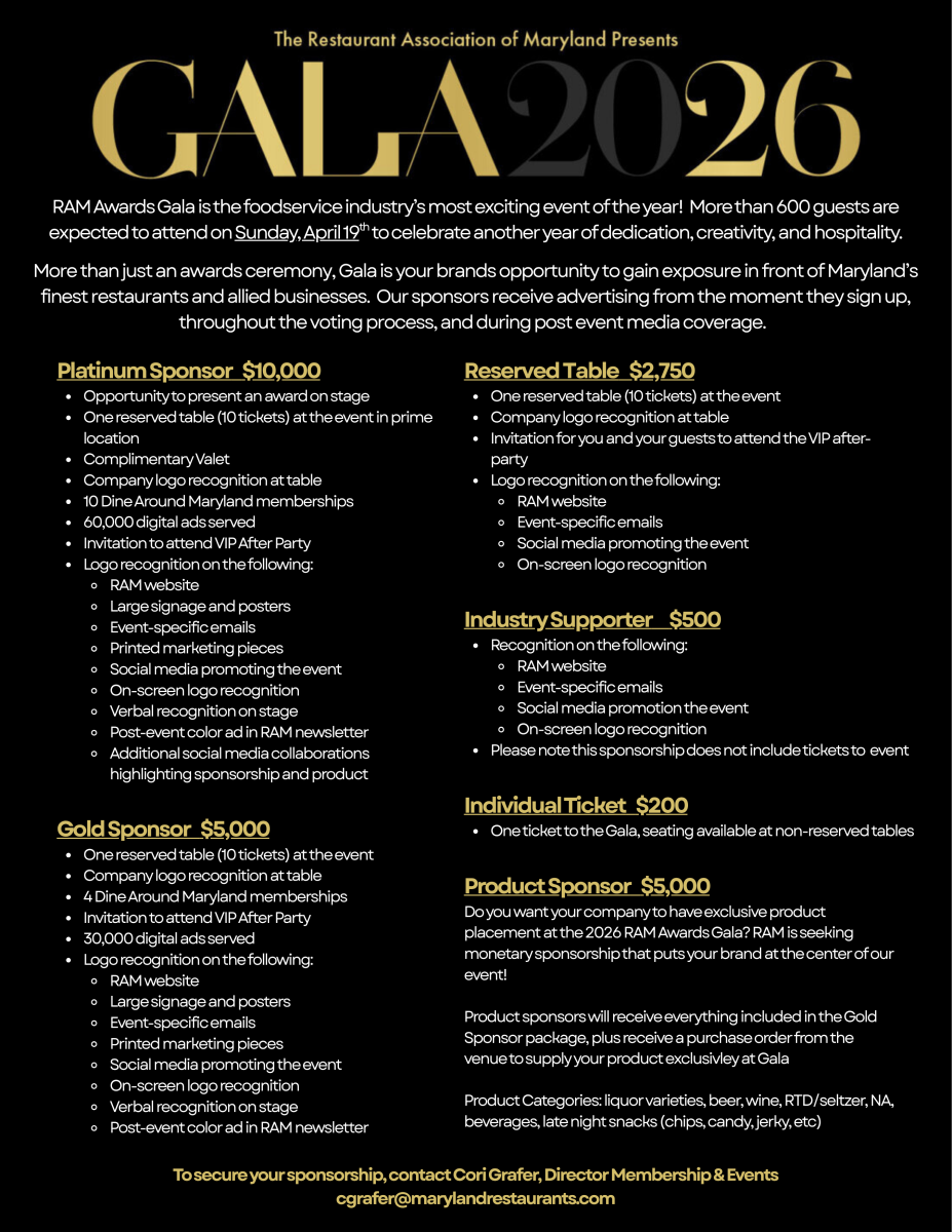 Please email Cori at cgrafer@marylandrestaurants.com with any questions and final attendee lists.